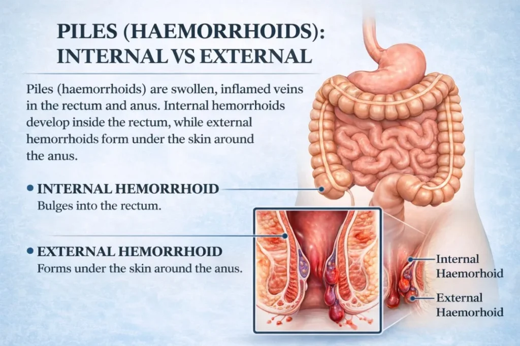 Internal piles occur inside the rectum and may bleed painlessly during bowel movements. External piles develop outside and often cause discomfort while sitting or walking.