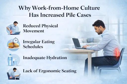 Moreover, corporate routines encourage long hours of sitting, irregular hydration, and stress-driven eating habits. Together, these pose a significant risk of developing piles from prolonged sitting.